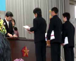校長先生の式辞の後は始業式も兼ねているので各学年代表に教科書が渡される。最後に生徒会長の歓迎の言葉と新入生の中学生活への抱負が語られて閉会となった。