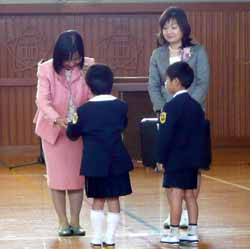 今年の新入生は33名ずつ丁度3クラスの99名。担任の呼名に「ハイ」と返事をして立っていく。面白いもので小学校を卒業した時、大きくなったものだと感じた子供達が小さく可愛らしく見える。