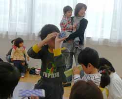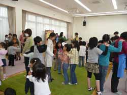 その後でみんな仲良くなれるようにもう一遊び。お母さん達も巻き込んで手遊びや身体を動かす遊び。