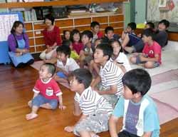 4時、今度は第2地区の人達と別の学童保育所へ。ちょうどおやつの時間で手を洗う子、当番でおやつをグループの人数分もらいに来る子など大騒動。ようやくグループごとに集まって黙想・おやつを食べ始めて静かになったところでお話を聞いた。