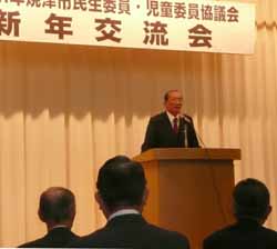 会長挨拶の後、家の父と同い年の社協の会長さんがお元気に登壇。さらに他の会合から駆けつけて見えた新市長(写真)の挨拶、乾杯と続き会食。