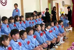 今年の卒園児は34名、みな緊張してお客さんの待つホールに入ってくる。園歌を歌ううちに緊張はほぐれたようだ。さっそく園長先生から保育証書が1人ずつに渡される。