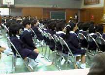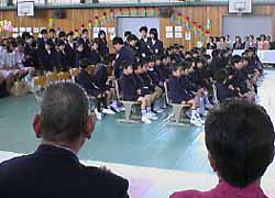 こちらは4クラス、122名。6年生の先導でやって来た子供達は席についても大集団だけに、なかなかおとなしく前を向いて座っているという訳にはいかない。保育園の園長先生を見つけてうれしそうに手を振ったり、後ろの保護者席のお家の人を探したり…。