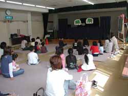 子供達は小さい子を中心に20名強。半分位はお話をするおばさんのまわりに寄って一生懸命聞いている。残りはお友達とはしゃいだり、広い所でのびのびとしたい様子。絵本・紙芝居など6本。ちょうど1時間をびっしりと使った。