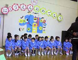 何しろ初めての集団生活。お母さんと手をつないで会場に入って来て小さなイスに腰掛けるまでが一騒動。迎える年長さんも今日からお兄さん・お姉さんなのでまだ実感はいまひとつ。にぎやかである。