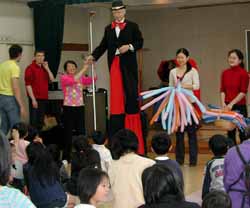 ダンスを見せてくれたり、英語の歌遊びをしたり、劇を見せてくれたりと短い時間の中で飽きさせないように進めてくれる。最後に1本の風船を使って犬を作るバルーンアートに挑戦。