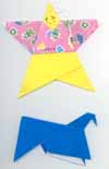 黄色い小さな四角2つを組んだ本体にひとまわり大きい四角で服を折って着せ掛けると星の上半身がちがう色に出る。頭に紐を通して、顔を描いて出来上がり。これは公民館祭りの作品用に大きい台紙に皆の星を張って保存。早く上手にできたので色違いの服でもう2つ。背中の部分にお手紙を挟んでメッセンジャーにする事もできるそうだ。