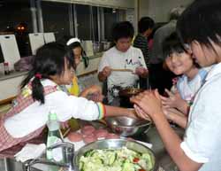 本日は帰ってきた子供達と班ごとに買い物に出て夕飯つくり。うちの班はハンバーグとフルーツポンチだそうで、近くのスーパーまで歩いて行って野菜や肉・果物の缶詰など必要なものを買う。予算の\2500を班長が持たされていたのだが、いささか足が出て、監督のおじさんに足してもらった。