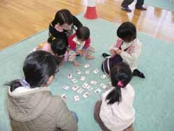 その後はお正月らしい色々な遊び。バドミントンや羽根突き、コマ、けん玉、お手玉、あやとり、双六や福笑い、トランプなど、「色々な遊びにチャレンジしよう」と時間を見ながら入れ替えをした。