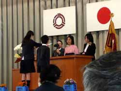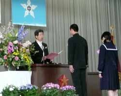 まず、卒業証書授与式。残念ながら3名が欠席、遅刻?だったのか呼ばれてバタバタと後ろから突っ走ってきた男の子が1人。これがうわさの腰パンか!という子が1人。こう書くとなんだか荒れているようだが、そんな事はまったくなく、みな姿勢正しくきちんと座っている。合唱教育に力を入れているので歌を歌うと迫力がある。