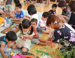 まず、来た子から短冊に願い事を書く。それから飾り物の工作、切り紙の投網や貝、星飾りなどを作って竹に飾った。