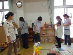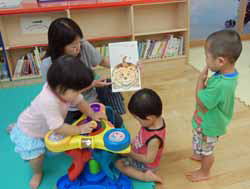 少し違う形が市の子育てサポートルームと児童館と一緒の大井川とまとぴあで、支援員の数は同じだが、市内全域・市外まで視野に入れた施設なので、支援員さんが来ている子供達全体を相手にした毎日のウェルカムタイムの遊びや読み聞かせの時間を取ったり、様々な行事を入れたりしている。とまとぴあは大きい子供達も来るのでこの春から夏は皆でゴーヤーを育てて収穫して食べる『いいこといっぱい大作戦』を行うなど異年齢の子供達との交流の場ともなっているようだ。ここは他と違って土・日も開いているので(月曜休み)他の子育て支援センターから「週末はとまとぴあへ」とも言われているそうだ。