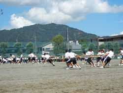 100m走から始まり、長距離走、ふれあい種目、竹取り合戦と続いて学年対抗全員リレー。結局プログラム通り午前の部が終わったのは1時前だった。グランドコンディションもまずまずで、秋空のもと風も秋らしくなっていた。