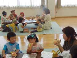 その後は手を洗いに行ってサンドイッチ作り。アルミホイルをお皿の代わりにして背割パンにマーガリンを塗り、レタス・チーズ・ソーセージをはさむ。その上にケチャップとマヨネーズで飾り付けをして出来上がり。子供達ケチャップやマヨネーズを大盛りにして、さすがに最後に感想を言う段になって「かけ過ぎた…」と言っていたが、みんな残さず食べていた。