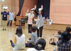 食べ終わって「解散にしましょうか」という頃に、こちらははだかっこの会の2度目の公演時間。今回は子供が小さいので『ブチョロビッチョロはどこ?』(大島妙子著 学研)に変えた。後のお2人は同じ。間に手遊びなどを入れてつないでくれた。