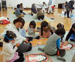 その後は羽根つき、福笑い、すごろく、コマ、けん玉、お手玉、あやとり、トランプなど普段あまりやらない遊びを体験。お母さん達もけっこう楽しんでいた。