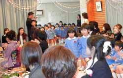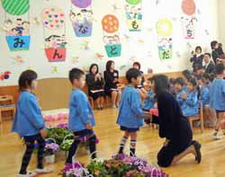 まず、園長先生に1人1人が保育証書を頂き、お家の人に手渡す。照れくさそうに渡す子も、「お母さん、美味しいお弁当ありがとう」としっかり言う子もある。お家の人もビデオ片手に最後まで我が子を撮り続けるママもあれば、真面目くさって保育証書を受け取る人も、子どもが歩いてきてからあわてて出てくる人もあり個性があって面白かった。