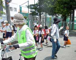 地下道の入り口では隣の地区の民児委員さんが旗振りをされていた。他の人通りもないので道いっぱいに広がってそれでも素直に帰っていく。途中で様子を見守っていた補導員さんとは毎日おなじみのようで小さい子供達が飛びついたりじゃんけんをしたり、ちょっと立ち話をしたり。