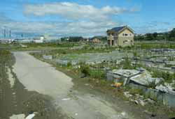 写真は石巻の津波跡。左斜め奥あたりが海の方向。少し高くなっている学校の前から取ったが、この門脇小学校の校舎も津波とその後の火災でかろうじて建物の形が残っているだけで、現在、子供達は中学の校舎を間借りして勉強しているそうだ。