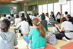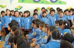 初めなので注意や約束などお話も多くなったが、『友達賛歌』を歌い、呼名。元気に返事をする子もいれば恥ずかしそうにお母さんにくっ付いてしまう子もいる。その後でボランティアの自己紹介。