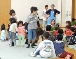 そして、身体を動かしてのゲーム。『おてらのおしょうさん』の手遊びじゃんけんや『なべなべそこぬけ』など人数を変えながら皆で遊んだ。最後は『友達賛歌』の踊り。大きい子供達に長年来ている子共達が何人かいて良いお手本になって皆で上手に踊れた。