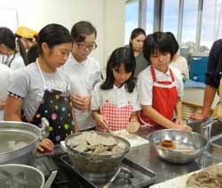 班ごとに教えてもらって黒はんぺんを作っている間、他の班はカツオ飯の具を切ったり、味噌汁やお浸しを作ったりして夕食の準備。担当のお母さん達が心配をしてかなり丁寧に下準備をしておいてくれたので、子ども達には少し物足りなかったかもしれないが割合にスムーズに作業が進んだ。