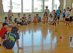 足場の輪から初めに投げた的の小さいボールに向けてゴムボールを投げ、どれだけ近くボールを付けられるかを競う。