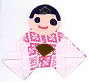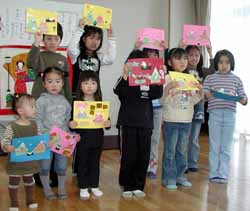 下の絵はじつは幼稚園と公民館の完成記念式典の時に頂いた幼稚園児の作った折り紙のお雛様。ようやく本日スキャナーを通して入れた。