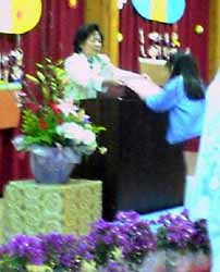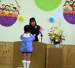 今年卒園する子供は35名。先生に1人ずつ名前を呼ばれてしっかりと返事をして入場してくる。開式の後、園長先生が1人1人にその子の良い所を褒めながら保育証書を渡す。園長先生やお客さんのお話をしっかりと聞いて、いよいよ在園児とのお別れの言葉。しっかりと覚えた言葉を一生懸命大きな声をそろえて言う。しかし、『思い出のアルバム』を歌う頃には目が潤んでくる子供達もいる。最後に在園児から冠をかぶせてもらって手をつないで退場。