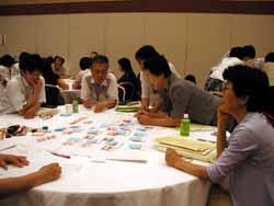 その次は2人1組で『出会いのこころみ』。こちらもカードの指示に従って話し手・聞き手を交互にしながら名前・誕生日などごく限られた項目からうれしかった事・いやだった事など漠然とした問題へと入っていく。聞き手はアドバイスをしない・すぐに判断をしない・意見や考えは述べずに相手の話をしっかり聴くというルールの下で話し合うがなかなか難しかった。これについては気付いた事を各自まとめた後でグループで話し合ったが、しっかり聴いてもらって話すのは楽しかったが聴くのは難しいねという話がかなり出た。