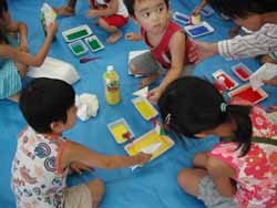 障害のある寝たきりの小さな子がお姉さんと来ていたが(お母さんが用事があるとの事で今日は子供達だけ預けていった)、周りの子供達もぶつからないように気を使ったりお友達になろうと側に寄ったり、なかなか興味深かった。お姉さんも妹の分を作って抱えて絵の具の所まで連れて行ってみたり、小さいのに手馴れた介助ぶりだった。