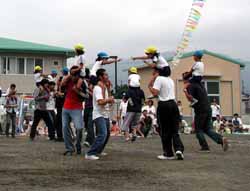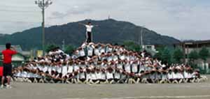 赤・白・青の3チームに分かれて、開会式。今年のスローガンは『研ぎ澄ませ闘争心 頂点を目指し 大きな結晶を創ろう』。各学年の100m走、長距離走、ムカデ競走などが続いた後、チーム対抗のバケツリレー。そして午前の最後がマスゲーム。2・3人組のものから、人数が増えて複雑になり、各学年ごとに1クラスで大きな形を作り、最後は全員がまとまって1つの形にまとめた。