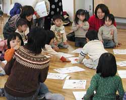 後はカルタ。準備した読み札を読みながら描きたい人に取り札用の画用紙を渡し絵を描いてもらう。好きな子は何枚も描いてくれるし、やっぱり使ったお話(童話や昔話から取った)に馴染みがなくてどんな絵を描いたら良いか分からないものも出てきたが、お父さん・お母さんの協力もあって全部絵が出来た。後はカルタ取りをするだけ。