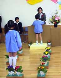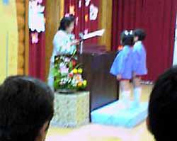 今年の卒園児は25名。みんなの見守る中を子供達が1人ずつ入ってくる。緊張した顔、ちょっと照れた顔、ニコニコ顔。さっそく保育証書の授与式なのだが、子供達の名前を呼ぶ担任の先生が感極まってしばらく言葉に詰まってしまった。一人ずつ園長先生に「よく頑張ったね」「○○が上手になったね」と褒められて保育証書を渡された。