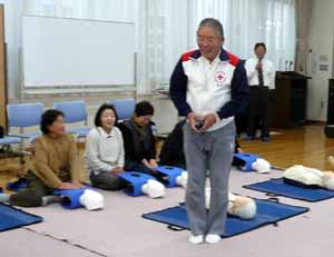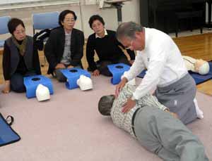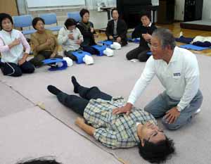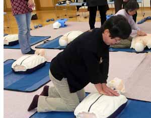 胸骨圧迫30回、子供は3cm、大人で5cmくらいのつもりで両手を重ねて真直ぐ下に押す。 人工呼吸と胸骨圧迫を繰り返し、酸素と血液が循環するようにして救急車を待つ。 |
