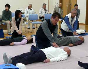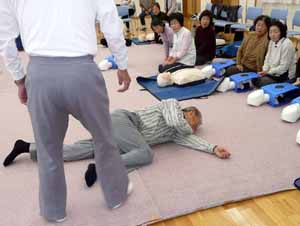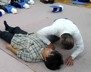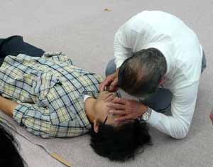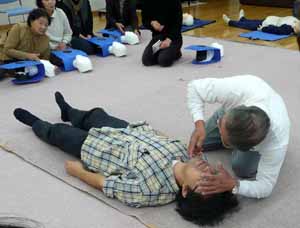 皆さん、しっかり実習しましょう 倒れた人の気道を確保する。