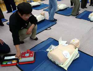 AED(自動体外式除細動器) スイッチを入れたら、汗などをぬぐい、金属性の物は取り除いてパッドを2箇所に取り付ける。 後は機械の指示に従って。 除細動のスイッチを押す時には、大きな電圧が掛かるので、周りの人がきちんと離れた事を確認してから。 |