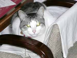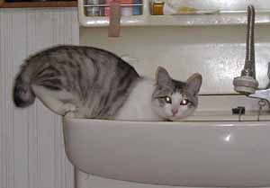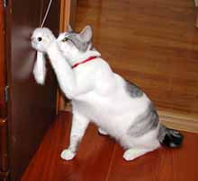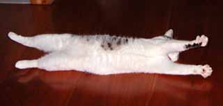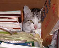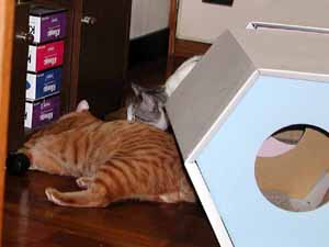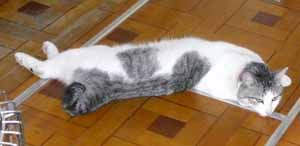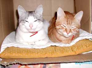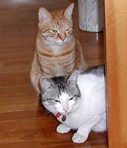 ところで育ち盛りの君達はもらうだけのご飯では夜中にお腹が空くらしかった。まず押入れの中にストックされているカリカリ、君達用だけでなくクロンとみゆの高齢猫用も勝手に開けて食べ放題。これをやられてはたまらないので君達はあまり好きではない段ボール箱に入れたけど、美味しいものが入っているとなったら話は別で、しっかりこじ開けるやら破くやらで効果なし。結局しっかりとふたのできるプラスチック容器に入れた。ところが君達もそれで大人しく引き下がるわけは無い。今度は流しの下の君達の当座のご飯用品が入っている所を狙いだした。缶詰は開かないのでここでも狙うのはカリカリ。ところがここの開きは素直には開かなかったらしい。隣の流しの下からザルを乗り越え当たり鉢を乗り越え裏からカリカリにたどり着く作戦を取った。ここは小袋の開けてある物を入れているのだが、素直にクリップを開けて自分でボールに入れて食べるわけも無く、爪で引っかいて袋を裂き、みんなばら撒いてそれでもそこで食べていたのかな?仕方なくこちらもタッパーにしまいこむ事になった。おかげで君達はムクムクと太った。それでも君の方が茶々より一回り大きく見えたけど、手術の時に量った目方はほとんど同じ、君の方が毛色が薄くてフワフワしているために大きく見えたらしいね。どちらにしても普通ネコは食べないレトルトカレーやインスタントラーメンをかじるよりは君達も成長をしたわけだ。