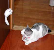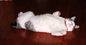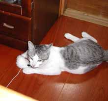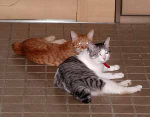 家に2匹で居ると昼間はどこかで大人しく寝こんでいての夜行性。お夕飯の時間にどこかの隅っこから出てきて、夜、人間が一段落した頃に玄関の私の周りで遊びだす、お夜食を食べてじいちゃんの所へ寝に行く、ネコとはよく言ったものでよく寝る子だった。