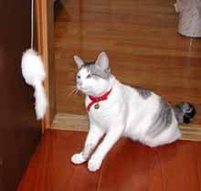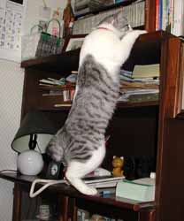 実は君達が昼間私が居る時に座敷や私達の部屋に来る事はあまり無かった。誰も居なければタンスの上に乗ったり、コタツに入ったり縁側でのんびりしていたらしいけど、私が来ると「まずい!」とばかりにスタコラと通り過ぎていった。それでもだんだんと君の出現頻度は上がっていった。客用布団の入っている押入れから飛び出してきた事も何度かあったね。もっと頻繁だったのがタンスの上で、しっかりと寝ていて転がり落ちかけた事も何度かあった。実際に転げ落ちた事もあったよね。君は大胆な割にはどこか抜けていて、ネコタワーでグッスリ寝込んで落ちたことも何度もあった。幸いネコなので、「わざとだよ」っという顔をしていたけど…。