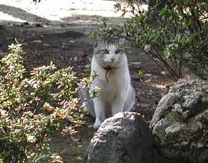 ところが、11月のある日、君は行方不明になった。夜中に茶々は「あぁ〜お、蒼!」と騒ぐし、翌日、庭や近所を探し回っても影も形も無い。事故にはあっていないようだが、どこまで行ったのだろうととても心配したんだよ。それが2日目の夜、「ご飯だよ」と呼んだらどこからか声がする、しかし姿は見えない。どこだろうと思ったら物置の中、一昨日いるのに気が付かないまま鍵を掛けられてしまったらしかった。暗くなって出してどこかへ行っても心配だし、私が迎えに行っても奥に隠れるだけなので、物置の中に餌を入れてまた鍵を掛けてしまった。夜中にしっかり食べたようだが、翌日じいちゃんに出してもらうまで閉じ込められたままだった。それからも何度か物置閉じ込め事件は起こったね。蒼にとっては物置は別荘みたいなものだったのかな。 どっちにしろこの頃ようやく外に出ている君の写真を撮ることができた。そして君はじいちゃんが手を叩いて呼ぶとちゃんと帰って来るようになった。ところが、茶々は出かけてしまうと呼べど戻らず、たいてい君が迎えに行ってくれたね。一緒に帰ってくることもあれば、顔は見せても家には入って来ないこともあったけど。