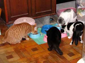 すでにこの頃、君は人間の食事の時にクロンやみゆのまねをして食卓の周りにやってくる事もあったんだね。「あげようか」って手に刺身を乗せてやっても迷っているうちにクロンやみゆに取られてしまったけど、何となく気にはなっていたでしょ。じいちゃんが「お昼は刺身にしよう」と言っては一口君に食べさせるのを楽しみにしていたけれど、なかなか手からは食べなかったね。それでも甘えん坊の君はじいちゃん・ばあちゃんのアイドルだった。ついでに君たち4匹が食事をしている写真はこれ1枚。何度かチャレンジしたのだが、1番逃げ足の速いのが君だった。
