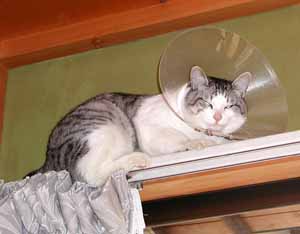 ずいぶん大人になった君達、男の子なのでそのままでも良かったのだがそろそろ去勢手術。蒼は何とか捕まったが、茶々は大暴れ。一度に連れて行っても獣医さんで困るので1週間の時間差になった。エリザベスカラーをされて不機嫌に帰ってきたけれど、君はしっかり予防注射もしてもらいとっても良い子だった。
