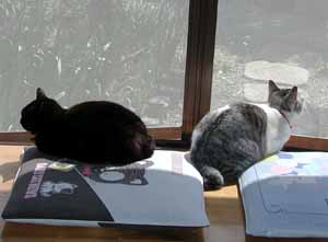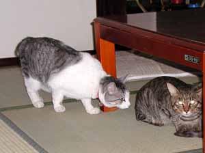 何通かのメールと写真、電話の行き来の後で、君達2匹は我が家へやって来る事になった。ところがその初っ端から一騒動だったのを覚えている?君達を連れてくるために、いつものおじさんのお家で食事を終えた君達は、ダンボール箱に詰め込まれた。それから彼のお姉さんの家へ、「開けて捕まえられなくなったら困る」とそのまま翌朝、待ち合わせをした私の友達の車に乗せられて君達は焼津までやって来た。玄関に入れた箱の蓋を開けたとたんに君達はビックリ箱の人形のように飛び出したね。すっ飛び出ておいべつさんの棚の榊をひっくり返し、ガス台に登り換気扇の上まで飛び上がったのは君だったろうか、それとも茶々だったろうか。普通の子猫だろうとすぐに捕まえられると思った人間の思惑は見事に打ち砕かれた。そのまま縁側の物陰に飛び込んで隠れてしまった君達に私だけでなく連れてきた2人も会えないまま、お昼を食べてしばらく話をした後で彼女達は帰っていった。残された君たちは音なしの構え、ずいぶん心配したんだよ。
