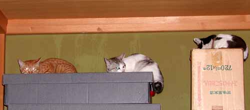 怯えている君達をそれ以上怯えさせたくないので放っておいたら、いつの間にかじいちゃん・ばあちゃんの部屋の縁側に引っ越していた君達、それでも少しずつあちらこちらを探索するようになっていた。歴代猫が好きなタンスの上も割りと早い時期に試してみたんだね。それ以後あまり乗らなかったからこんな写真があるのはすっかり忘れていた。