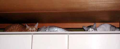 君達は夜は遊んだり、ラーメンやレトルト食品を齧って味見をしたり、しまってあるネコ砂をかき回したり、鉢植えをひっくり返してみたりと大暴れをしていたけれど、昼間はほとんど暖かな縁側に隠れていた。どこに居るんだろうかとよく探し回ったものだよ。君達の最初のお気に入りはなかなか考えられた場所で、きっと用心深い母さんネコがしっかりと教えていたのだろう。後付の天袋の上の僅かな隙間。暖かなお日様の光は入るし、高い所だからすぐには人間の手が届かない、しかも君達2匹にとっては充分な広さがあった。これはかなり良く写っている方だが、ほとんどがカメラを向けると君達が逃げ出して失敗作に終わっている。