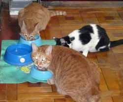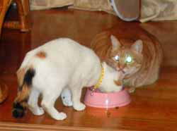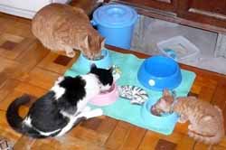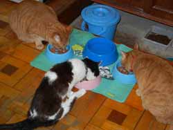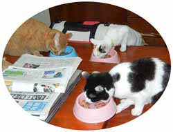 私が来た頃、TANUKIおじさんもDORAおばさんはまだお仕事で忙しかったけど、 おばあちゃんも居たし、おばあちゃんの部屋は隠れ場所もいっぱいあったし、私達だけでも楽しく過ごしていたんだよ。茶々を筆頭に時々人間のお布団にお漏らしをして叱られたり、私達がみゆさんのご飯に興味津々でみゆさんがゆっくり食べられないからって、ご飯を食べる場所がバラバラになったり色々あったけどね。左の写真は茶々は居ないけど皆でご飯を食べていた時の。同じ頃の茶々に見守られて食べているのも見つけた。