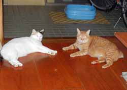 それでも4月頃には蒼が猫じゃらしで遊ぶようになり、茶々も隠れて見物している事もあったが、なかなか乗ってはこなかった。そして夏、人の出入りも多くなって、いつの間にか子猫たちもお外デビュー。2匹連れ立って、まだ外は警戒していつの間にか帰ってきていた。この夏の大イベントは日比の一族が我が家に結集、1泊していった。