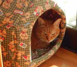 ちょっと前までは寝る時と朝DORAおばさんが起きる頃、DORAおばさんのお布団に潜り込んできたんだよ。私も一緒に寝ているのに。DORAおばさんが「茶々、足が冷たいね」って私とDORAおばさんの間に場所を作って茶々を入れていたんだ。茶々の涎や鼻水ですぐシーツやまくらカバーがベタベタになったけどね。最近は朝しか来なくって、死んだ日もちゃんと朝にはお布団に潜り込んできたんだよ。