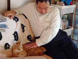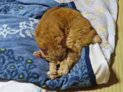 夜TANUKIおじさんがお布団を敷くと、気まぐれにTANUKIおじさんのお布団に居るようになったのもこの頃。たいていは人間が寝る頃にはソファに戻ってたけど。この頃には茶々はずいぶん痩せちゃって心配したんだよ。